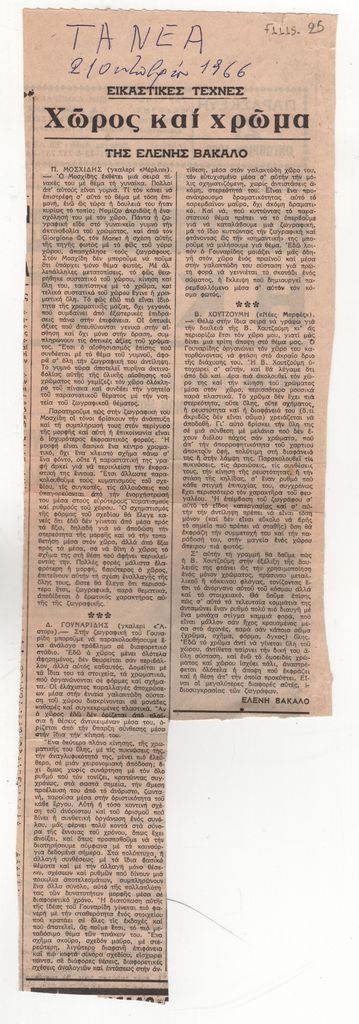Απόκομμα, έντυπο, χαρτί, 33,0×10,2 εκ., όπου δημοσιεύεται, στα ελληνικά, κριτική της Ελένης Βακαλό για τις ατομικές εκθέσεις των Π. Μοσχίδη, Δ. Γουναρίδη και Βέρας Χουτζούμη στην Αθήνα τον Οκτώβριο του 1966.