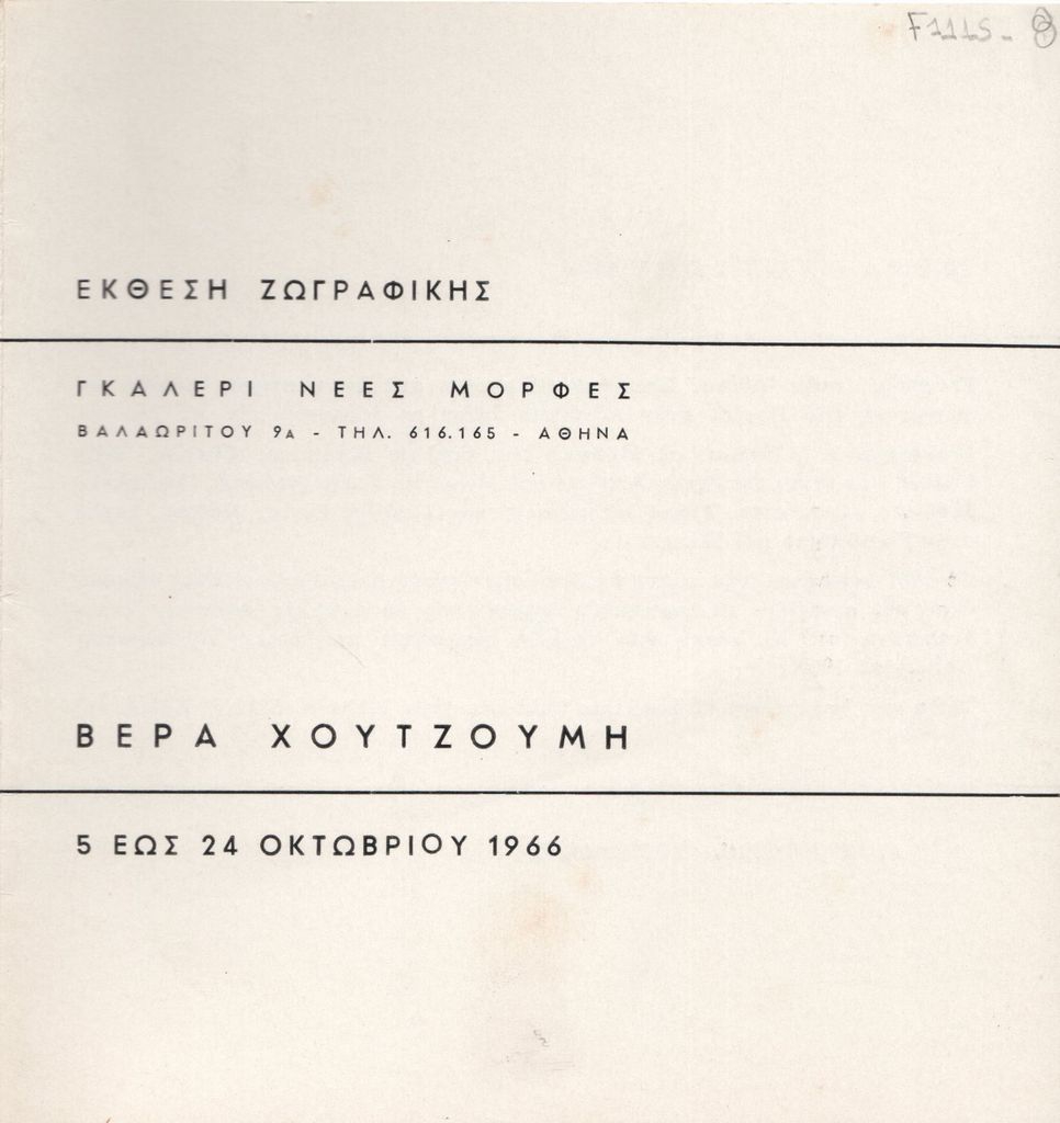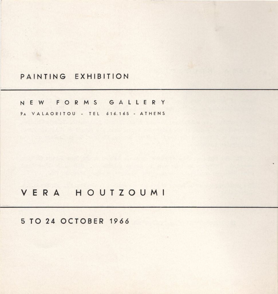 Φυλλάδιο της ατομικής έκθεσης ζωγραφικής της Βέρας Χουτζούμη στην Αθήνα το 1966. Περιέχει σύντομο βιογραφικό καλλιτέχνη.