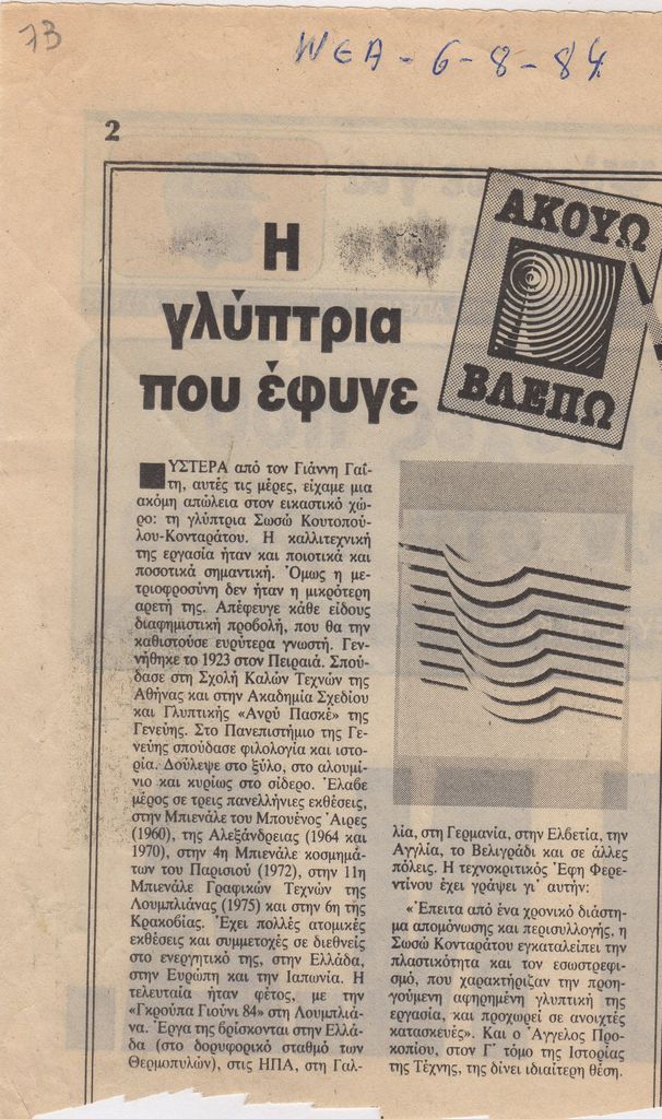 Απόκομμα, χαρτί, 19×12 εκ., στα ελληνικά, δημοσίευσης άρθρου αναφερόμενου στο θάνατο της Σωσώς Χουτοπούλου-Κονταράτου.