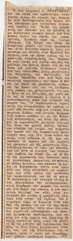 Απόκομμα, χαρτί, 17×5 εκ., στα ελληνικά, δημοσίευσης άρθρου, αναφερόμενου στο εικαστικό έργο του Λεωνίδα Χρηστάκη.
