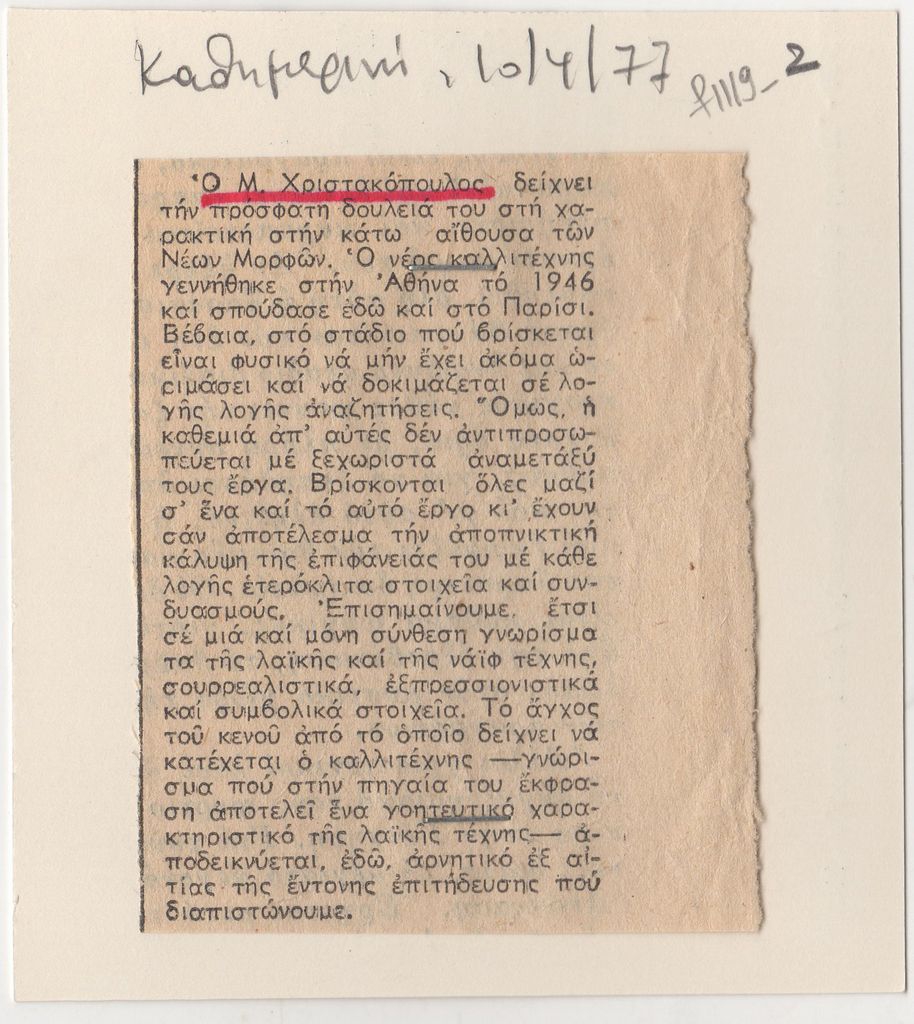 Απόκομμα, χαρτί συρραμμένο σε έντυπο, 10.5×9.5 εκ., στα ελληνικά, δημοσίευσης κριτικής έκθεσης του Μαρίνου Χρηστακόπουλου, η οποία διεξάγεται στην Γκαλερί Νέες Μορφές στην Αθήνα.