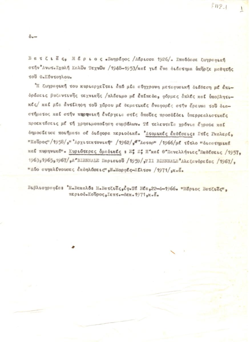 Βιογραφικό, δακτυλόγραφο, ριζόχαρτο, 28,5×21,5 εκ., στα ελληνικά, του Μάριου Βατζιά. Περιέχει προσωπικά στοιχεία, λίστα ατομικών και ομαδικών εκθέσεων και βιβλιογραφία.