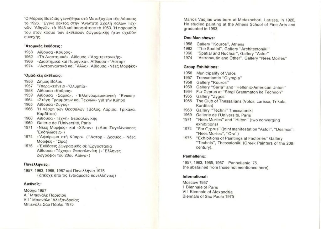 Έντυπο, χαρτόνι ιλλουστρασιόν, 24×17 εκ., στα ελληνικά και αγγλικά, αναδρομικής έκθεσης του Μάριου Βατζιά στη Aίθουσα Bιβλιοθήκης του Κολλεγίου Αθηνών. Περιέχει βιογραφικό του καλλιτέχνη, λίστα ατομικών, ομαδικών, πανελληνίων και διεθνών εκθέσεών του και εικονογράφηση.