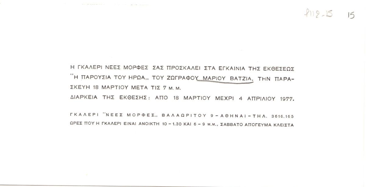 Πρόσκληση, χαρτόνι, 9,5×19 εκ., εγκαινίων ατομικής έκθεσης του Μάριου Βατζιά.