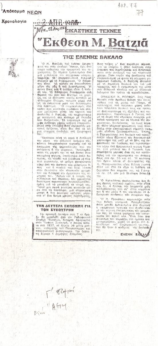 Φωτοαντίγραφο, χαρτί, 28×21 εκ., στα ελληνικά, δημοσίευσης κριτικής έκθεσης του Μάριου Βατζιά, η οποία διεξάγεται στην γκαλερί Άστορ στην Αθήνα, κατά το 1966.