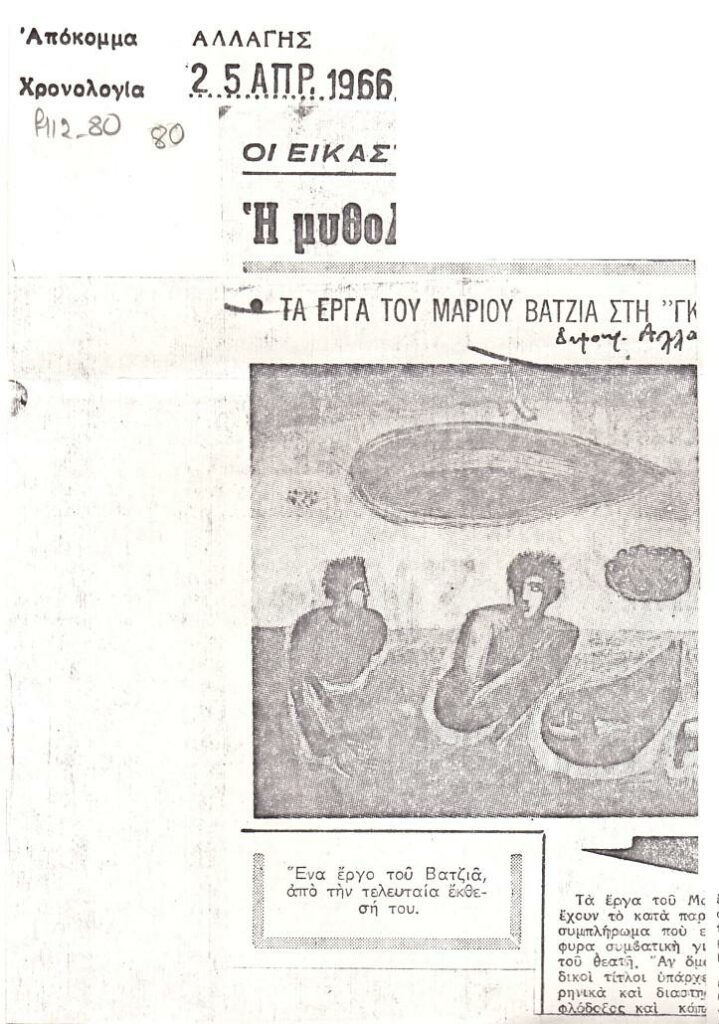 Φωτοαντίγραφο, χαρτί, 32×21 εκ., στα ελληνικά, δημοσίευσης κριτικής έκθεσης του Μάριου Βατζιά, η οποία διεξάγεται στην Γκαλερί Άστορ στην Αθήνα.