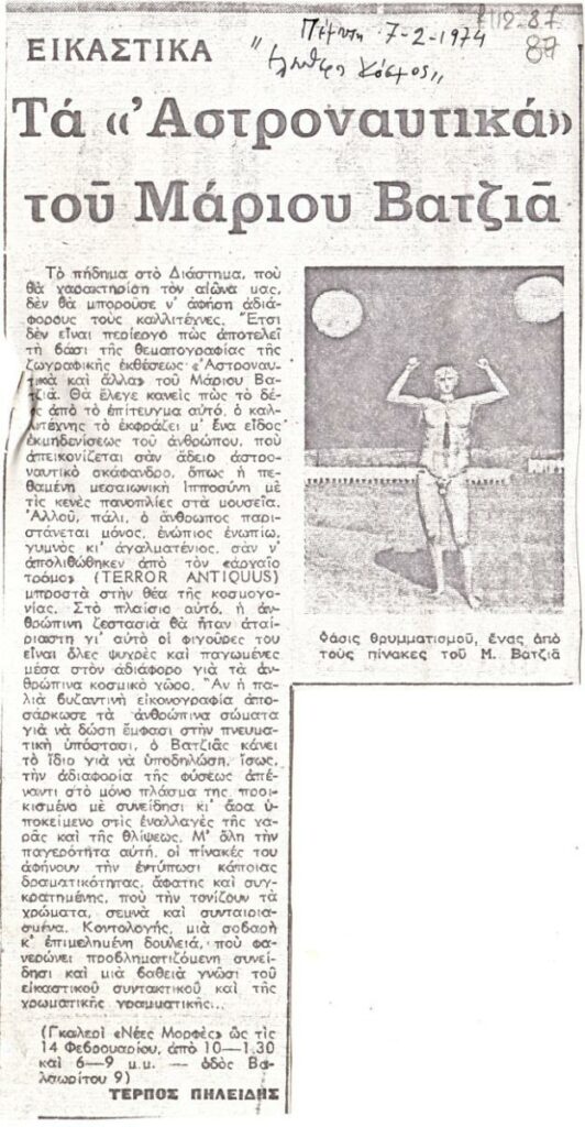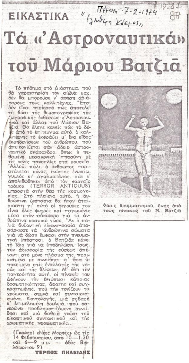 Φωτοαντίγραφο, χαρτί, 19,5×10 εκ., στα ελληνικά, δημοσίευσης κριτικής έκθεσης του Μάριου Βατζιά, η οποία διεξάγεται στην Γκαλερί Νέες Μορφές στην Αθήνα. Εντάσσεται στη στήλη “Εικαστικά” του εντύπου. Το απόκομμα εικονογραφείται και φέρει επιγραφές.