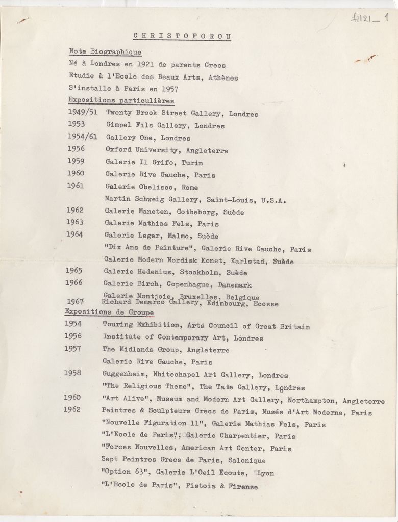 Βιογραφικό, δακτυλόγραφο, χαρτί, 2 φφ, 27×21 εκ., στα γαλλικά, του Τζων Χριστοφόρου.