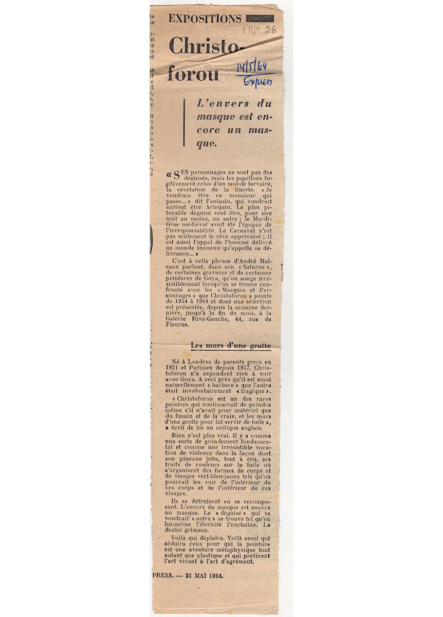 Απόκομμα, χαρτί, 32×7 εκ., στα γαλλικά, δημοσίευσης κριτικής έκθεσης του Τζων Χριστοφόρου, η οποία διεξάγεται στην γκαλερί Rive Gauche στο Παρίσι.
