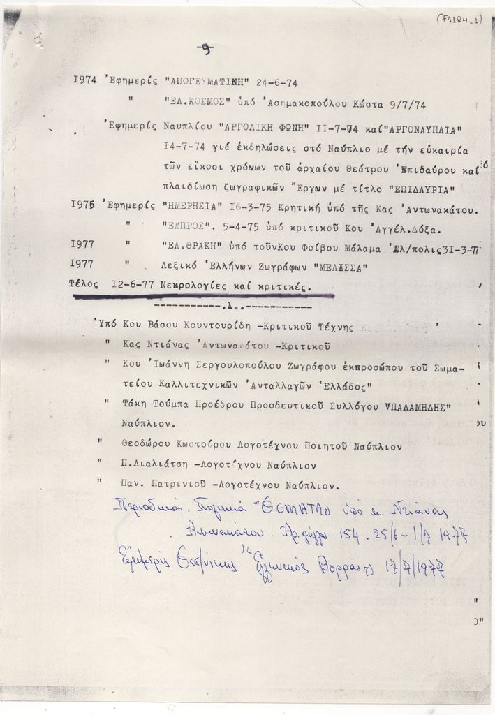 Κείμενο, στα ελληνικά, δακτυλόγραφο, με χειρόγραφες διορθώσεις και συμπληρώσεις, με μπλε μελάνι, χαρτί, 9 φφ μίας όψης, 29,8×21,2 εκ.