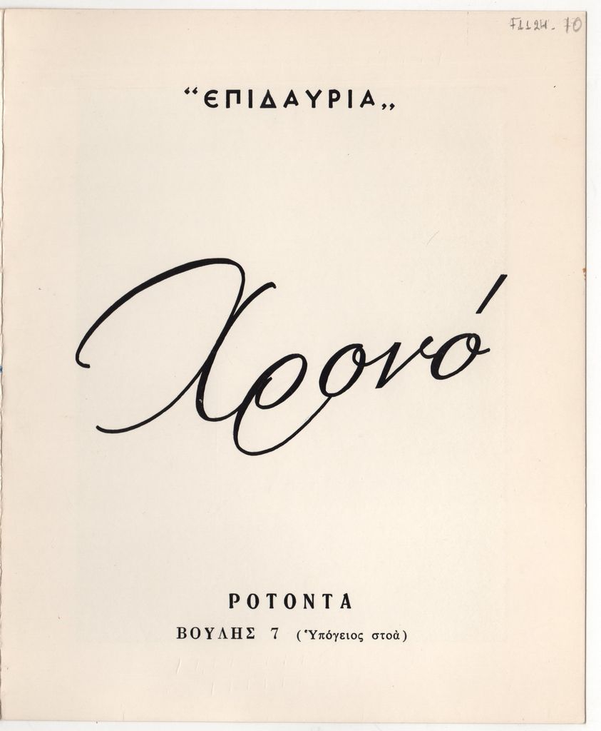 Φυλλάδιο της ατομικής έκθεσης έργων του Νίκου Χρονόπουλου με τον γενικό τίτλο «Επιδαύρια» στην Αθήνα [το 1974]. Περιέχει κείμενο του Βάσου Κοντουρίδη, βιογραφικό σημείωμα του καλλιτέχνη και κατάλογο των έργων της έκθεσης.