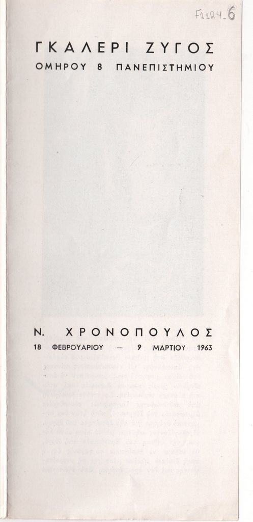 Έντυπο, στα ελληνικά και γαλλικά, τρίπτυχο, ιλουστρασιόν χαρτί, 21,2×10,0 εκ. Φυλλάδιο της ατομικής έκθεσης ζωγραφικής του Νίκου Χρονόπουλου στην Αθήνα το 1963. Περιέχει κείμενο του Γιώργου Μουρέλου, κατάλογο εκθέσεων του καλλιτέχνη, κατάλογο των έργων της έκθεσης και αποσπάσματα κριτικών για την έκθεση του καλλιτέχνη στο Παρίσι το 1961.