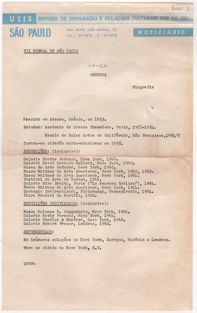 Βιογραφικό σημείωμα της Χρύσας σε έντυπο της VII Μπιενάλε του Σάο Πάολο, στην οποία συμμετείχε το 1963. Αναφέρονται σπουδές, ατομικές και ομαδικές εκθέσεις.