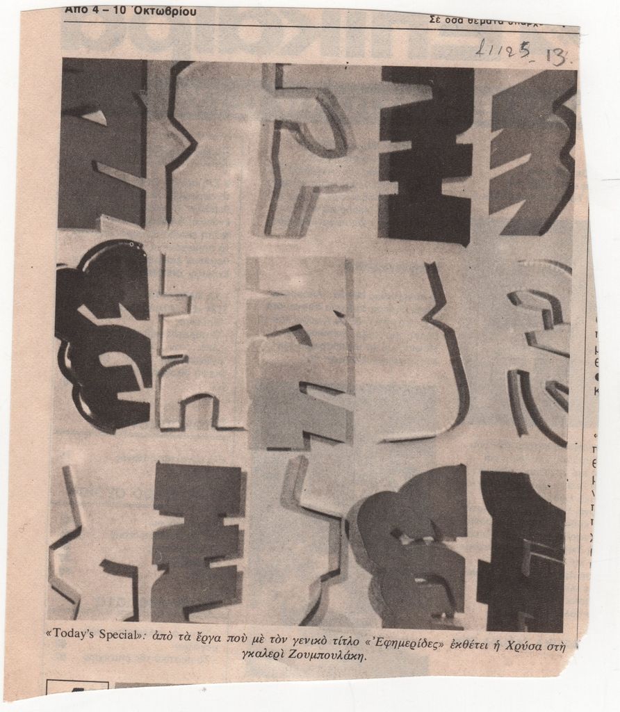 Απόκομμα, έντυπο, χαρτί, 16,5×14,0 εκ. Αναπαραγωγή έργου της Χρύσας με αφορμή την έκθεσή της με γενικό τίτλο “Εφημερίδες” στην Γκαλερί Ζουμπουλάκη στην Αθήνα.
