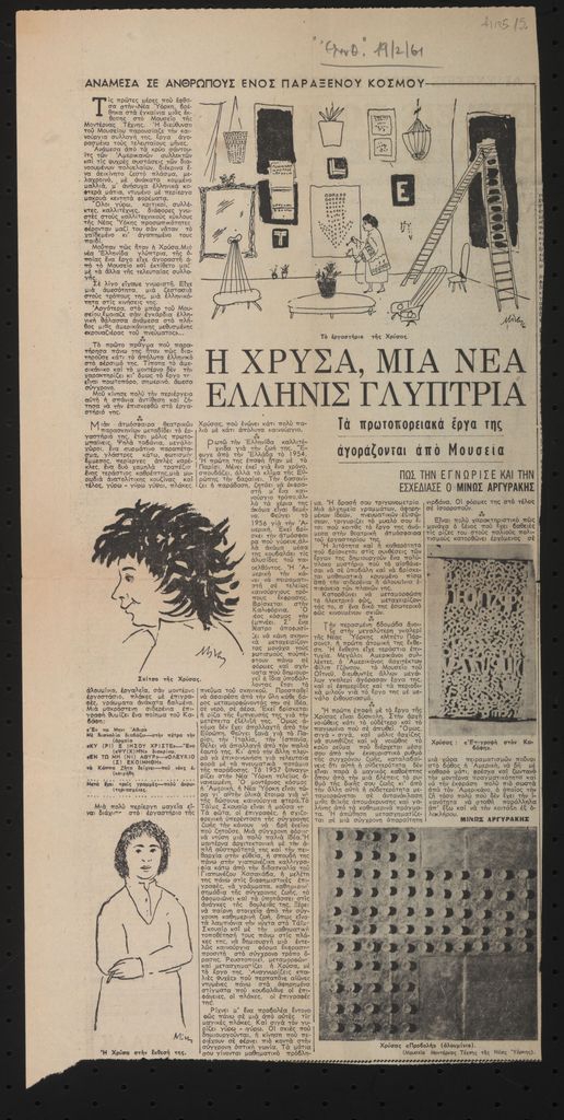 Απόκομμα, έντυπο, χαρτί, 44,5×22,0 εκ., όπου δημοσιεύεται, στα ελληνικά, άρθρο του Μίνου Αργυράκη για τη ζωγράφο και γλύπτρια Χρύσα με αφορμή την πρώτη ατομική της έκθεση στην Νέα Υόρκη το 1961.