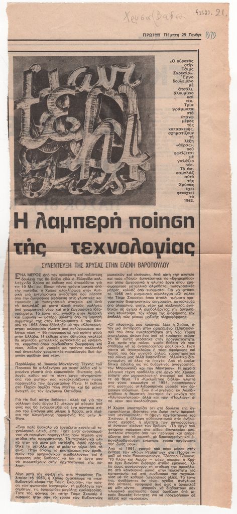 Απόκομμα, έντυπο, χαρτί, 37,0×16,8 εκ., όπου δημοσιεύεται, στα ελληνικά, συνέντευξη της γλύπτριας και ζωγράφου Χρύσας στην Ελένη Βαροπούλου με αφορμή επικείμενη έκθεσή της στην Αθήνα το 1979.