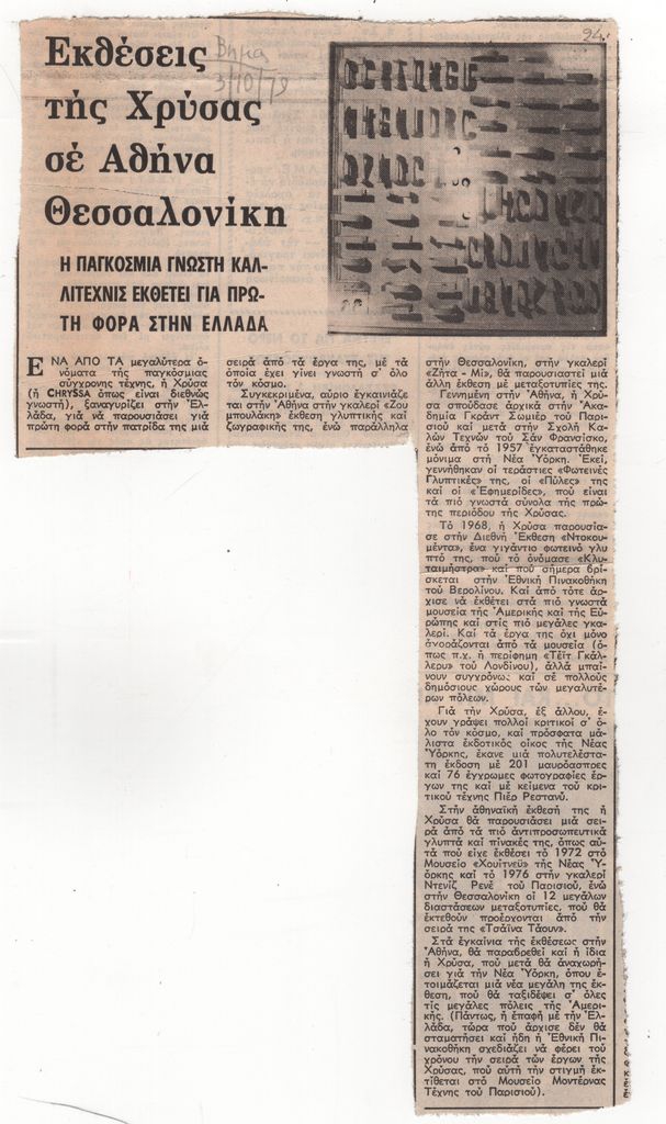 Απόκομμα, έντυπο, χαρτί, 27,7×15,2 εκ., όπου δημοσιεύεται, άρθρο για τις επικείμενες εκθέσεις της γλύπτριας και ζωγράφου Χρύσας στην Αθήνα και τη Θεσσαλονίκη το 1979. Επάνω, επιγραφή.