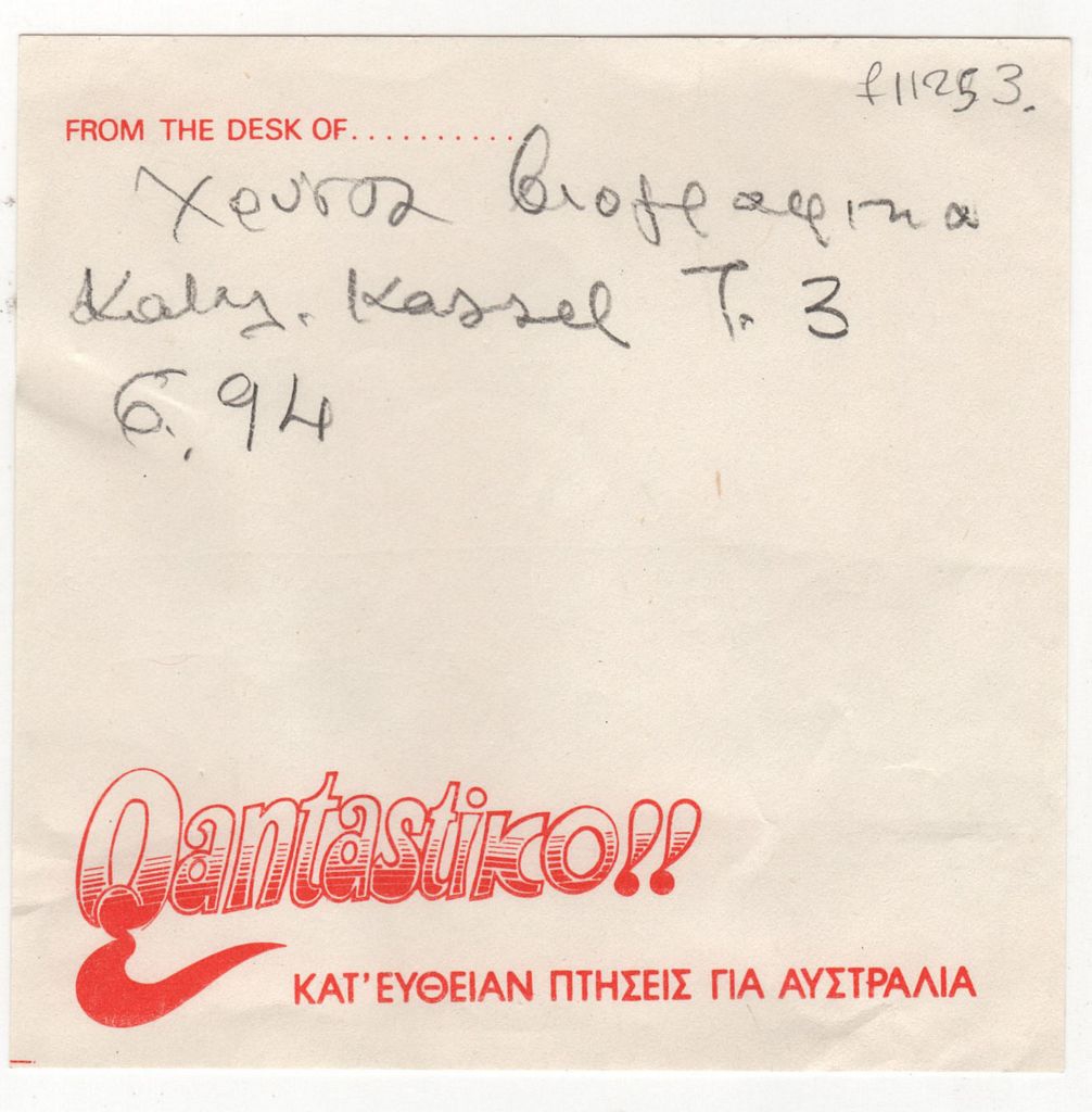 Κείμενο, χειρόγραφη, με μολύβι, στα ελληνικά, σε χαρτί σημειώσεων της αυστραλιανής αεροπορικής εταιρίας Quantas, 10,0×10,0 εκ.
