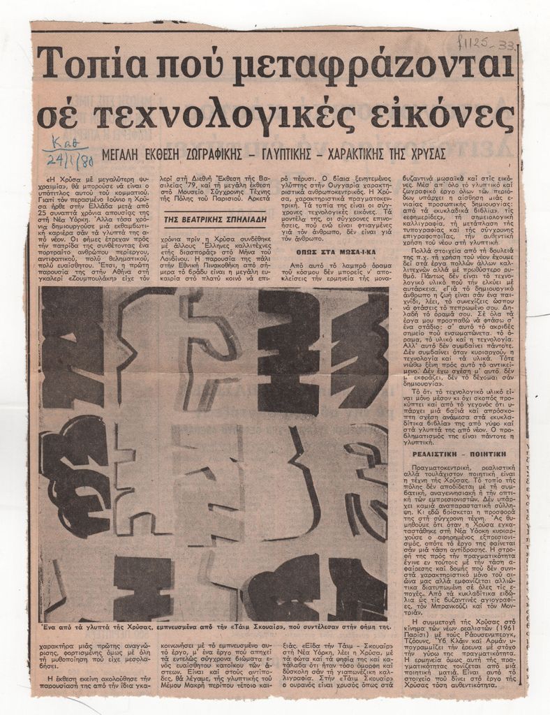 Απόκομμα, έντυπο, χαρτί, 28,0×21,0 εκ., όπου δημοσιεύεται, στα ελληνικά, κριτική της Βεατρίκης Σπηλιάδη για την ατομική έκθεση έργων της γλύπτριας Χρύσας στην Εθνική Πινακοθήκη και Μουσείο Αλέξανδρου Σούτζου στην Αθήνα το 1980.