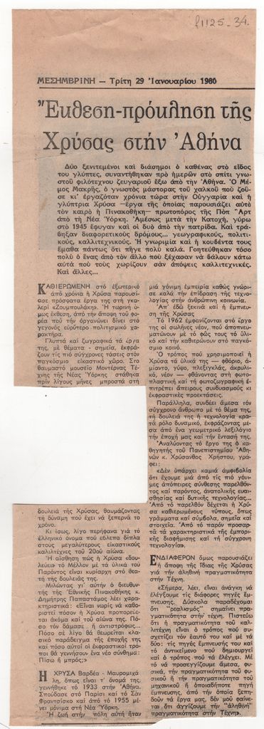 Απόκομμα, έντυπο, χαρτί, 31,5×11,0 εκ., όπου δημοσιεύεται, στα ελληνικά, κριτική της ατομικής έκθεσης της γλύπτριας Χρύσα στην Αθήνα το 1980. Περιέχει απόσπασμα κριτικής του Χρύσανθου Χρήστου.