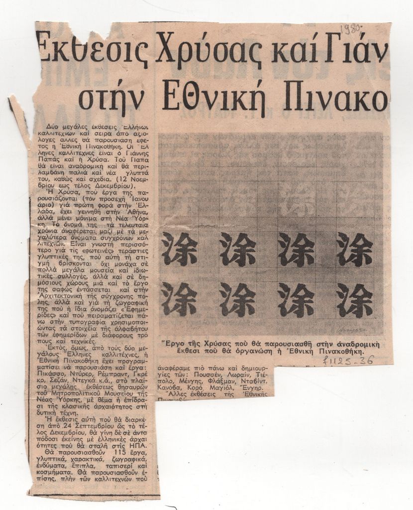 Απόκομμα, έντυπο, χαρτί, 20,0×15,2 εκ., όπου δημοσιεύεται, στα ελληνικά, άρθρο για τις επικείμενες εκθέσεις της εικαστικού Χρύσας και Γιάννη Παππά στην Εθνική Πινακοθήκη καθώς και του υπόλοιπου προγραμματισμού του φορέα για το έργο 1980.