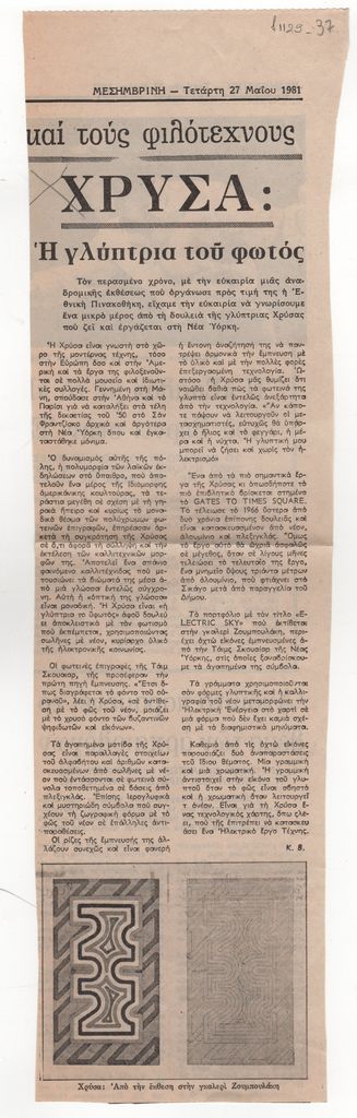Απόκομμα, έντυπο, χαρτί, 39,5×11,0 εκ., όπου δημοσιεύεται, στα ελληνικά, κριτική του/της Κ. Β. για την ατομική έκθεση έργων της Χρύσας με γενικό τίτλο “Electric Sky” στην Αθήνα τον Μάιο του 1981.