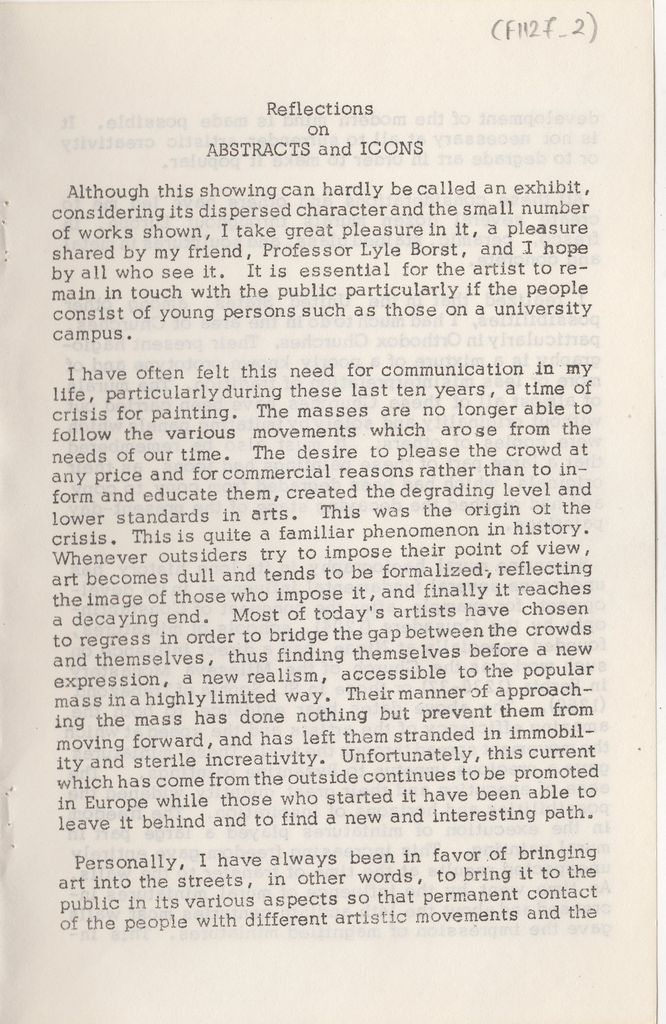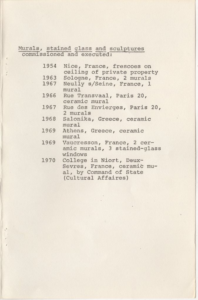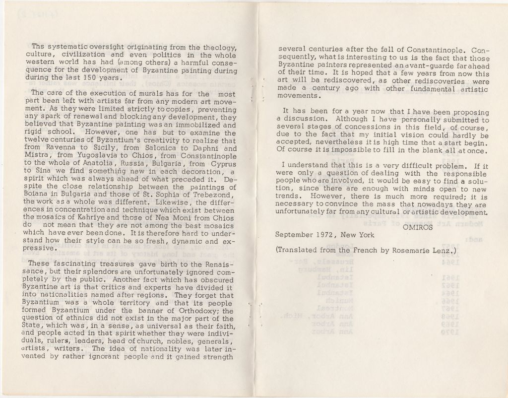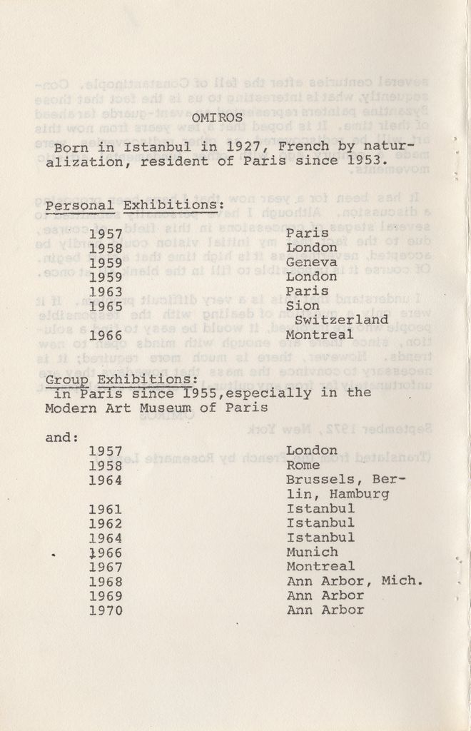 Δακτυλόγραφο έντυπο, χαρτί, 4 φφ, στα αγγλικά, έκθεσης του Όμηρου Χρυσόπουλου. Περιέχει κείμενο του καλλιτέχνη για το έργο του και βιογραφικό σημείωμα με λίστα εκθέσεων.