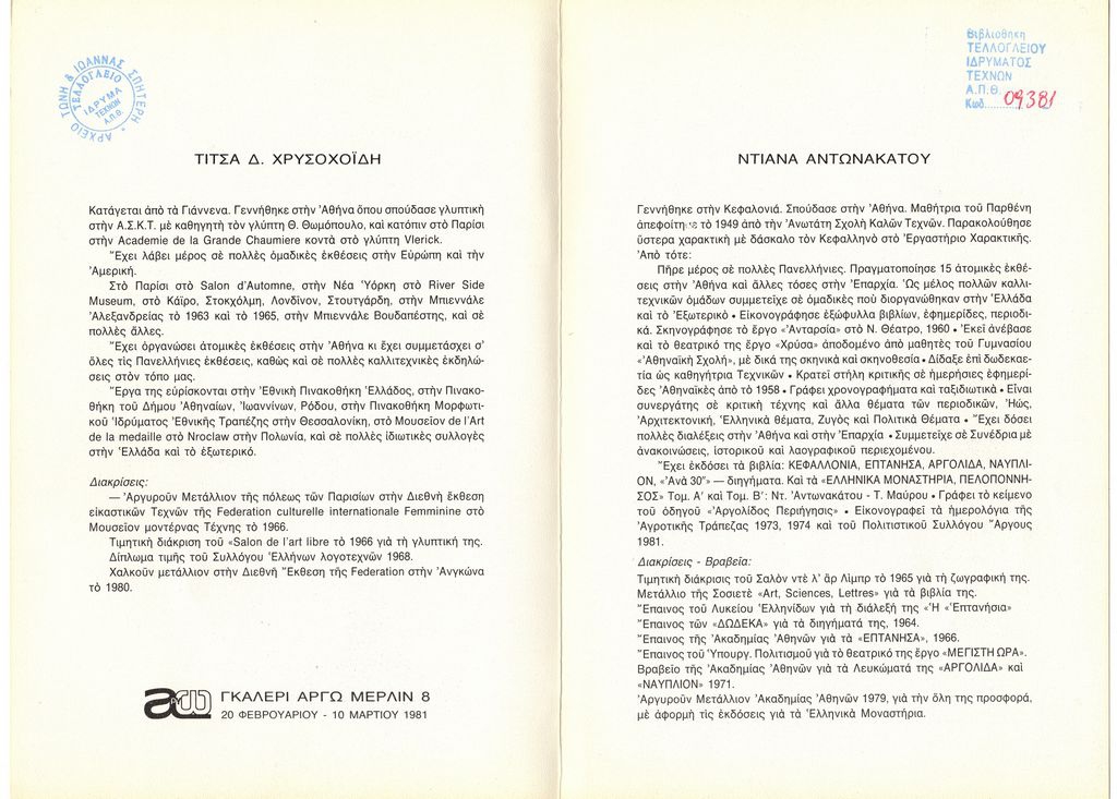 Έντυπο, στα ελληνικά, δίπτυχο, χαρτόνι, 24,0×16,2 εκ.Φυλλάδιο των παράλληλων εκθέσεων της γλύπτριας Τίτσας Χρυσοχοΐδη και της ζωγράφου Ντιάνα Αντωνακάτου στην Γκαλερί Αργώ στην Αθήνα το 1981. Περιέχει βιογραφικά καλλιτεχνών. Εξωτερικά, εικονογράφηση.