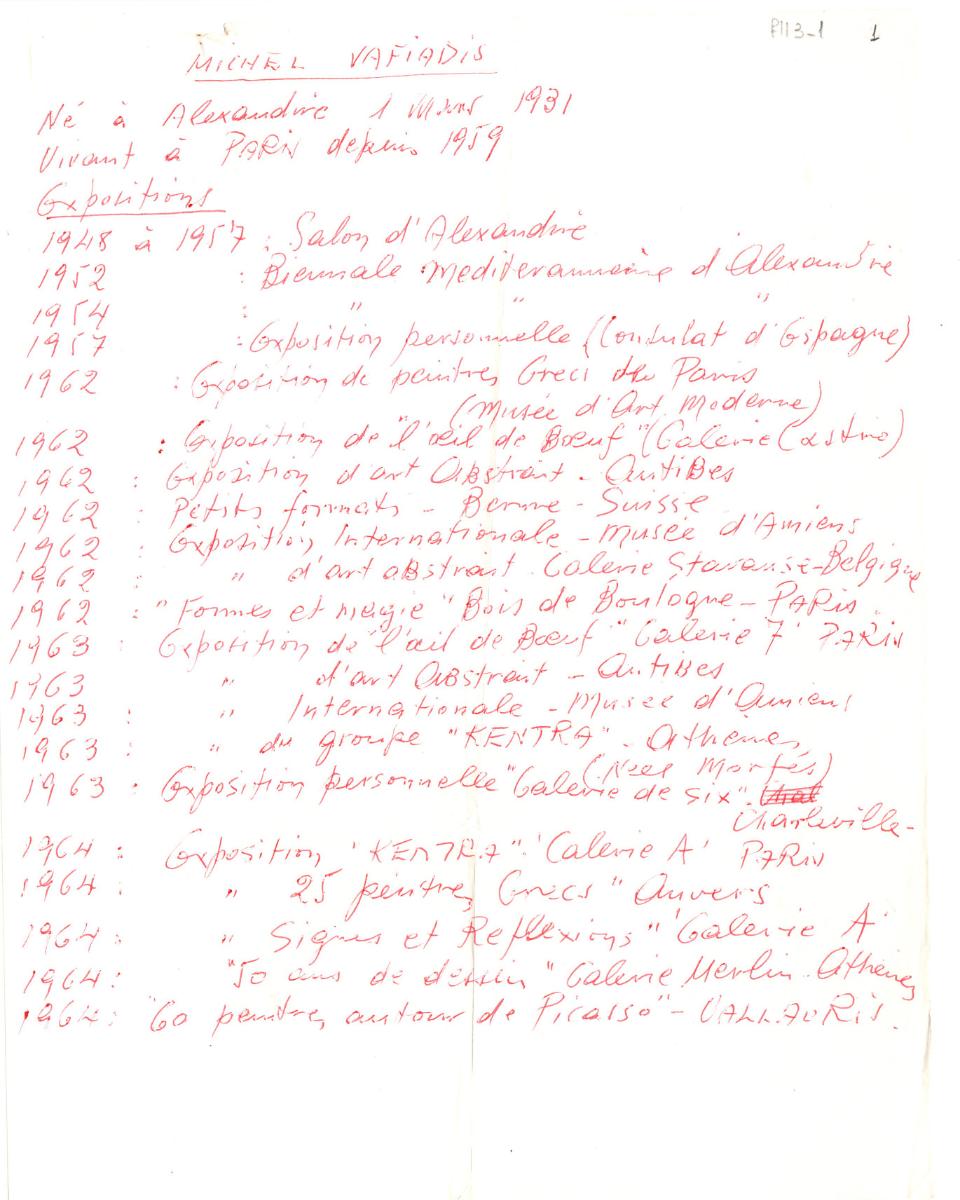 Βιογραφικό, χειρόγραφο, 27×21 εκ., στα γαλλικά, του Μιχάλη Βαφειάδη.
