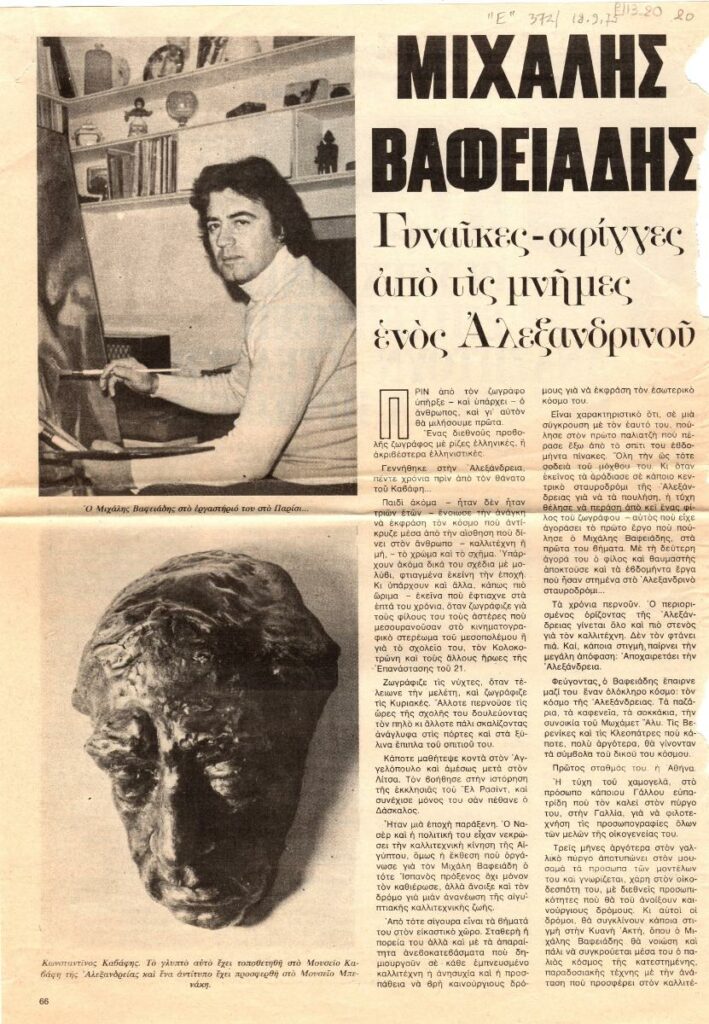 Αποκόμματα, χαρτί, 2 φφ, 33,5×23,5 εκ., στα ελληνικά, δημοσίευσης άρθρου για τον Μιχάλη Βαφειάδη και το έργο του.