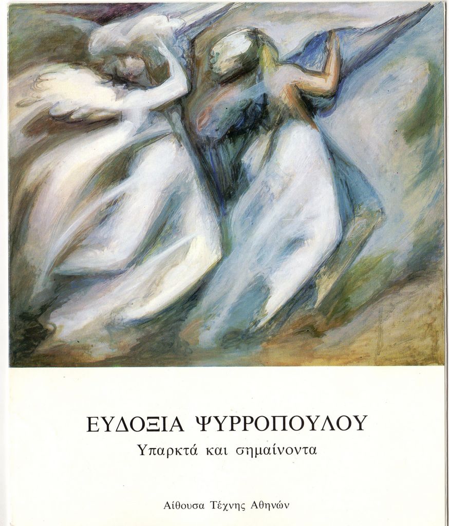 Έντυπο, στα ελληνικά,τρίτπυχο, χαρτόνι, ιλουστρασιόν, 23,5×19,5 εκ. Φυλλάδιο της ατομικής έκθεσης ζωγραφικής της Ευδοξίας Ψυρροπούλου στην Αθήνα το 1986. Περιέχει βιογραφικό καλλιτέχνη και αποσπάσματα κριτικών των: Δ. Παπαστάμου, Α. Δεληβορριά, Κ. Σπετσιέρη-Beschi, R. del Puglia.