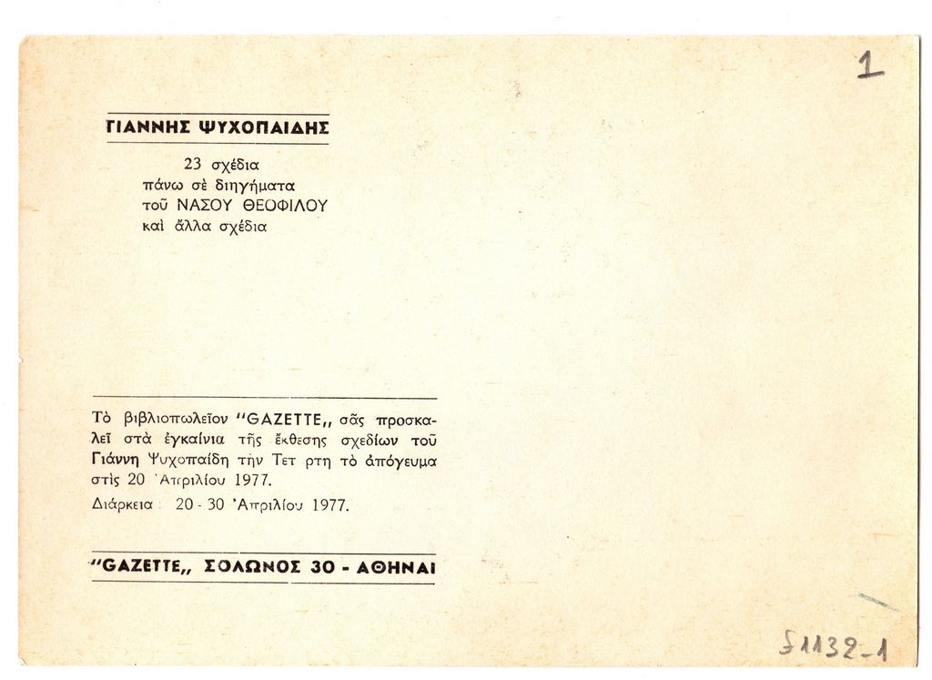 Πρόσκληση, χαρτόνι, 11.5×16.5 εκ., στα ελληνικά, εγκαινίων έκθεσης του Γιάννη Ψυχοπαίδη.