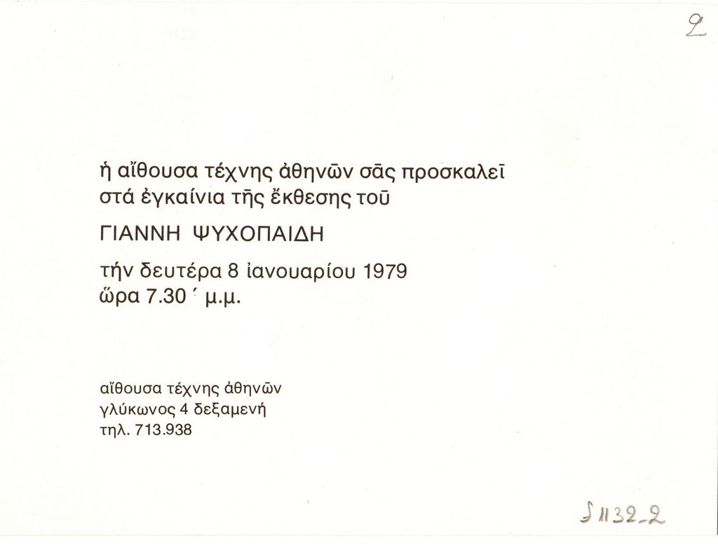 Πρόσκληση, χαρτόνι, 10,5×15 εκ., στα ελληνικά, εγκαινίων έκθεσης του Γιάννη Ψυχοπαίδη.