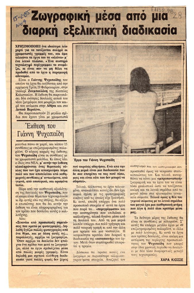 Απόκομμα, χαρτί, 24×15.5 εκ., στα ελληνικά, δημοσίευσης άρθρου αναφερόμενου σε έκθεση του Γιάννη Ψυχοπαίδη, η οποία διεξάγεται στην Γκαλερί Ζουμπουλάκη στην Αθήνα.