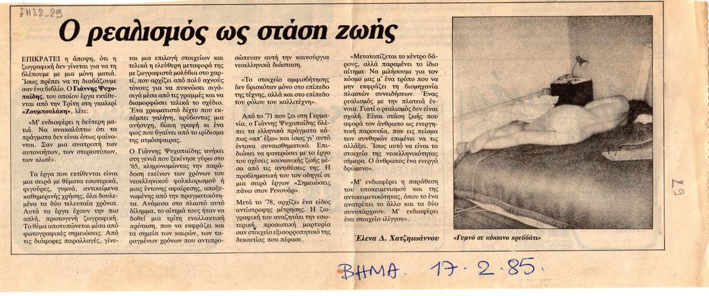 Απόκομμα, χαρτί, 12.5×30 εκ., στα ελληνικά, δημοσίευσης κριτικής έκθεσης του Γιάννη Ψυχοπαίδη, η οποία διεξάγεται στην γκαλερί Ζουμπουλάκη στην Αθήνα.