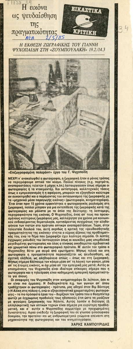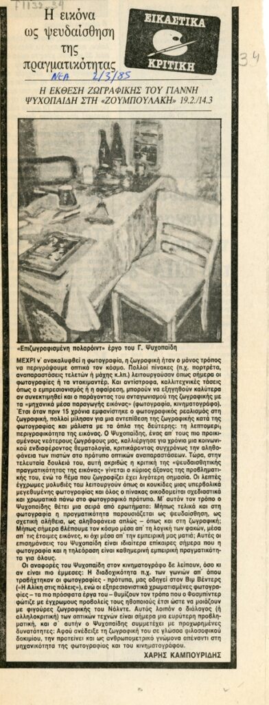 Απόκομμα, χαρτί, 29.5×11.5 εκ., στα ελληνικά, δημοσίευσης κριτικής έκθεσης του Γιάννη Ψυχοπαίδη, η οποία διεξάγεται στην Γκαλερί Ζουμπουλάκη στην Αθήνα.