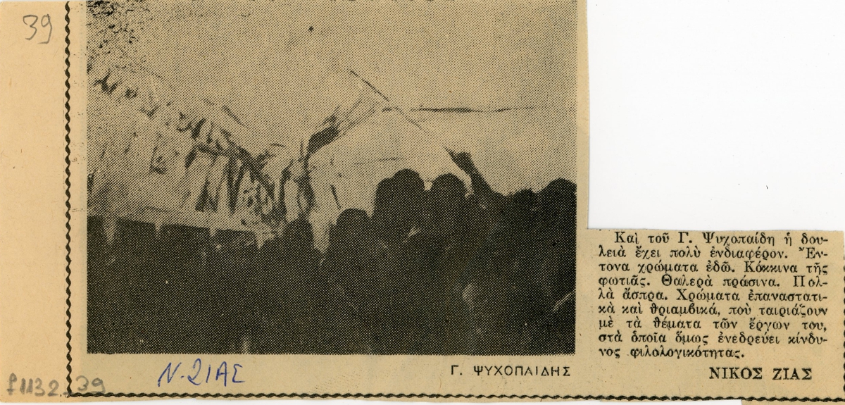 Απόκομμα, χαρτί, στα ελληνικά, με αναπαραγωγή και κριτική έργου του Γιάννη Ψυχοπαίδη.