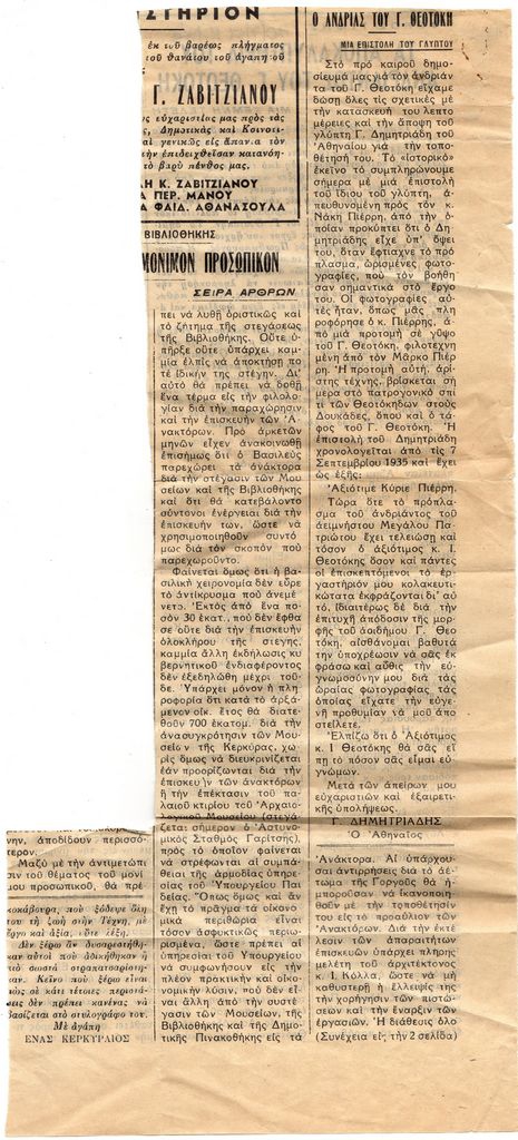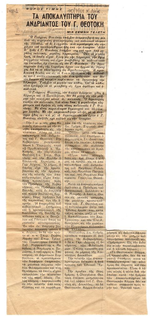 Απόκομμα, έντυπο, χαρτί, δύο όψεις, 36,2×16,5 εκ., όπου δημοσιεύεται, στα ελληνικά, άρθρο για τα αποκαλυπτήρια του αδριάντα του πολιτικού Γεωργίου Θεοτόκη, τον οποίο φιλοτέχνησε ο Γεώργιος Δημητριάδης ο Αθηναίος, που βάσισε το έργο του σε μία προτομή σε γύψο, έργο του Μάρκου Πιέρρη. Περιλαμβάνει επιστολή του Δημητριάδη προς τον Πιέρρη.