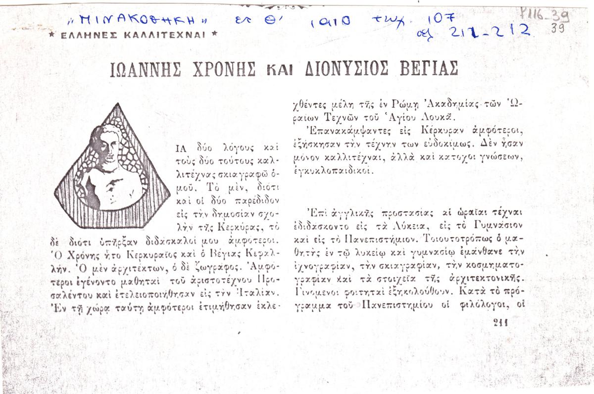 Φωτοαντίγραφο, χαρτί, 2 φφ, 12×19 και 29×19 εκ. αντίστοιχα, στα ελληνικά, δημοσίευσης άρθρου για τους Ιωάννη Χρόνη και Διονύσιο Βέγια.