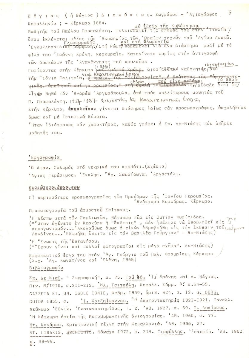Βιογραφικό, δακτυλόγραφο, χαρτί, 29,5×21 εκ., στα ελληνικά, του Διονύσιου Βέγια ή Βέγιου. Περιέχει προσωπικά στοιχεία, εργογραφία και βιβλιογραφία. Ειδικότερα για τον καλλιτέχνη έχουν γράψει :