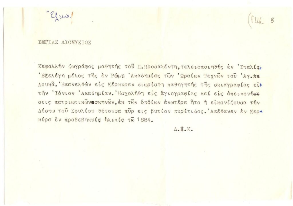 Αποδελτίωση λήμματος, δακτυλόγραφο, χαρτί, 14,5×21,5 εκ., στα ελληνικά, για τον Διονύσιο Βέγια από το εγκυκλοπαιδικό λεξικό Ελευθερουδάκη.