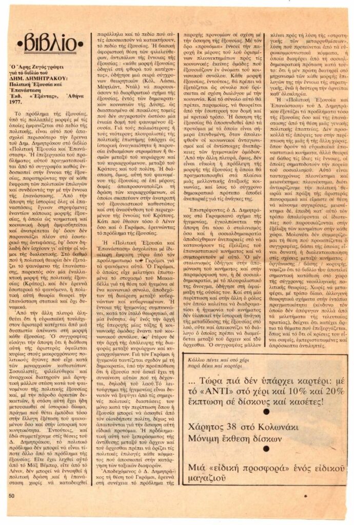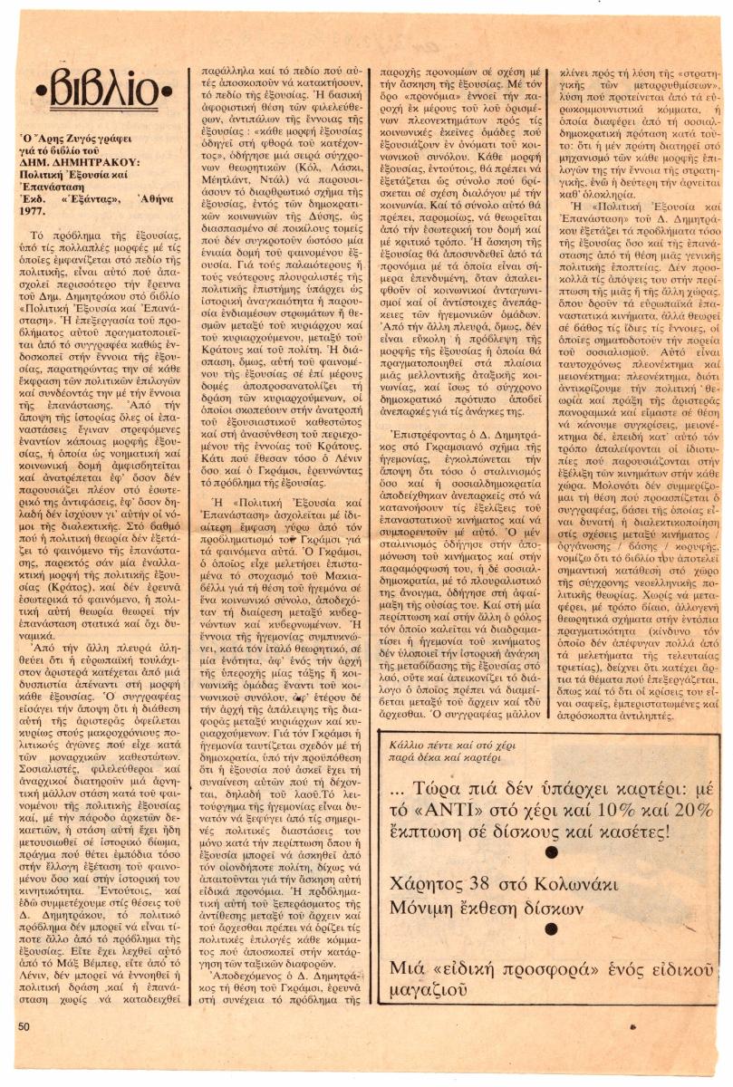 Απόκομμα, χαρτί, 28×18,5εκ. στα ελληνικά, δημοσίευσης βιβλιοκριτικής του Άρη Ζυγού για το βιβλίο του Δ. Δημητράκου “Πολιτική Εξουσία και Επανάσταση”, Εκδ. Εξάντας, Αθήνα, 1977.