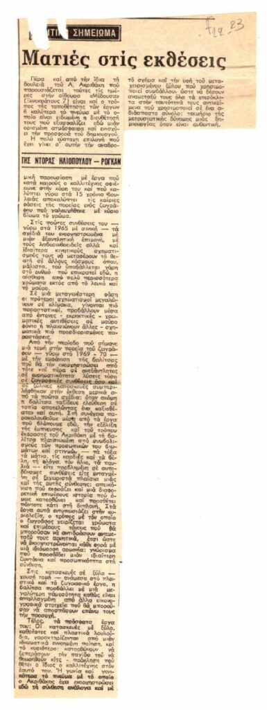 Απόκομμα, χαρτί, 32×11,5 εκ., στα ελληνικά, κριτικής έκθεσης του Αλέξη Ακριθάκη, η οποία διεξάγεται στην γκαλερί “Μέδουσα” στην Αθήνα.