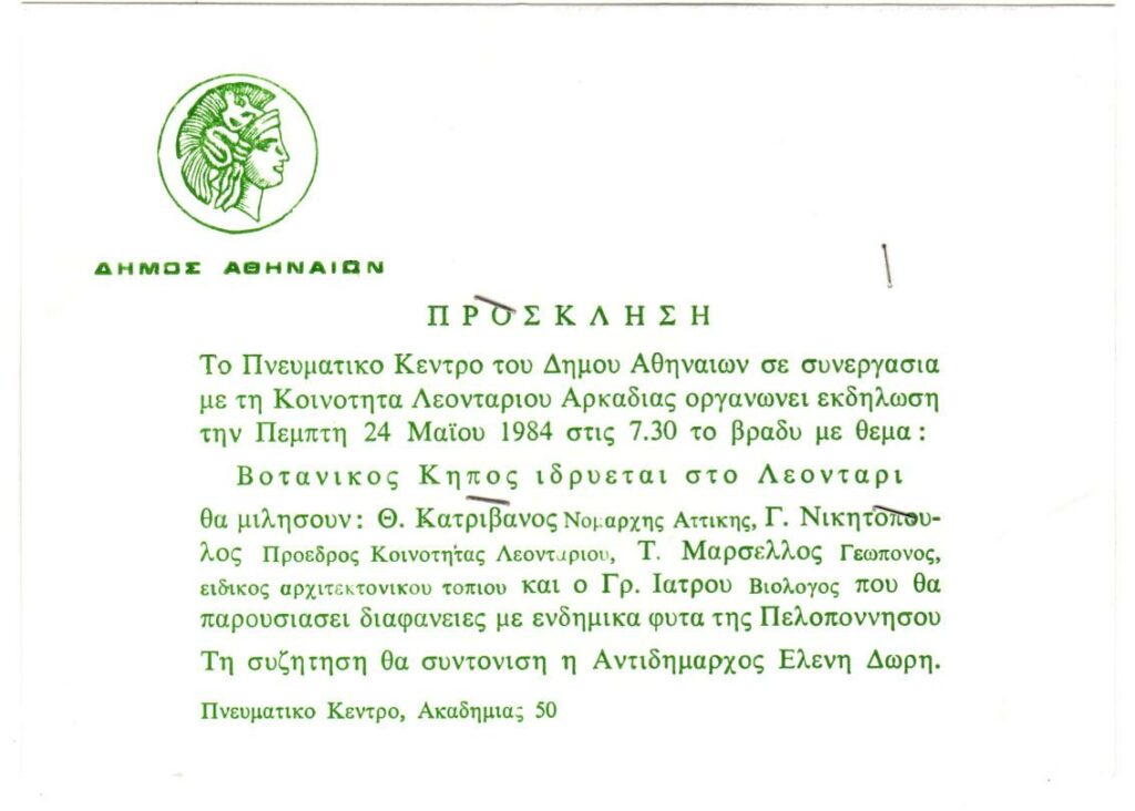 Το παρόν βρέθηκε συρραμμένο σε πρόσκληση εκδήλωσης με θέμα “Βοτανικός Κήπος ιδρύεται στο Λεοντάρι”.