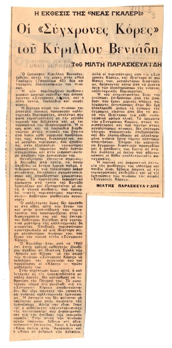 Απόκομμα, χαρτί, ακανόνιστου σχήματος, στα ελληνικά, δημοσίευσης κριτικής έκθεσης του Κύριλλου Βενιάδη, η οποία διεξάγεται στην Γκαλερί Νέες Μορφές στην Αθήνα.