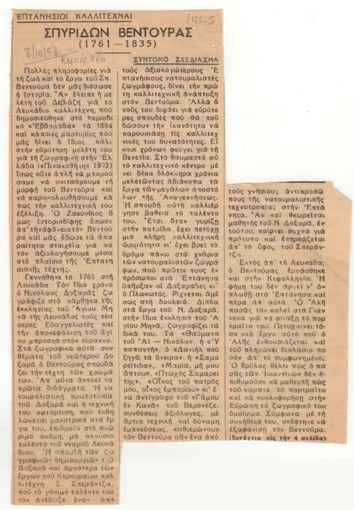Αποκόμματα εφημερίδας, χαρτί, 2 φφ, 23,3×16,0 εκ. και 16,0×10,0 εκ. (ακανόνιστο σχήμα), στα ελληνικά. Δημοσίευμα για τη ζωή και το έργο του καλλιτέχνη στη στήλη “Επτανήσιοι καλλιτέχνες”
