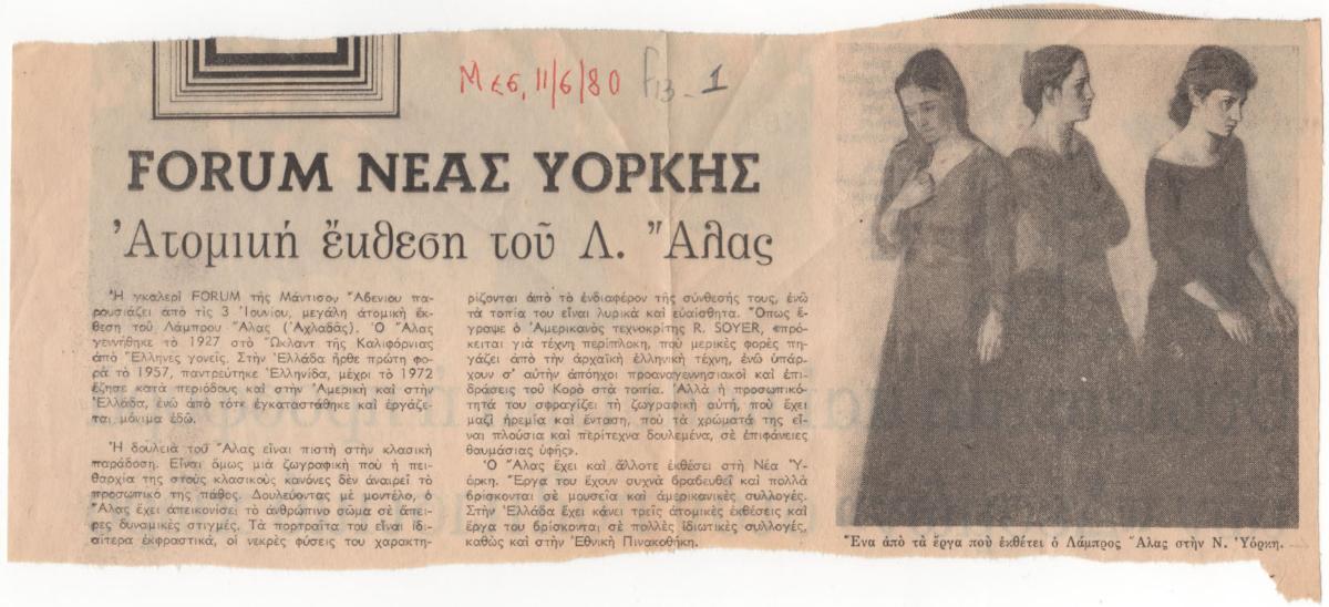 Απόκομμα, έντυπο, χαρτί, 11,5×26,7 εκ.,όπου δημοσιεύεται, στα ελληνικά, ανυπόγραφο άρθρο σχετικά με έκθεση έργων του Λάμπρου Άλας στην Γκαλερί Forum της Νέας Υόρκης το 1980. Εικονογραφείται με αναπαραγωγή έργου του καλλιτέχνη. Επάνω, επιγραφή με τα στοιχεία δημοσίευσης. Στην άλλη όψη επικεφαλίδα άρθρου σχετικά με τον θίασο “Δεσμοί” με εικονογράφηση.