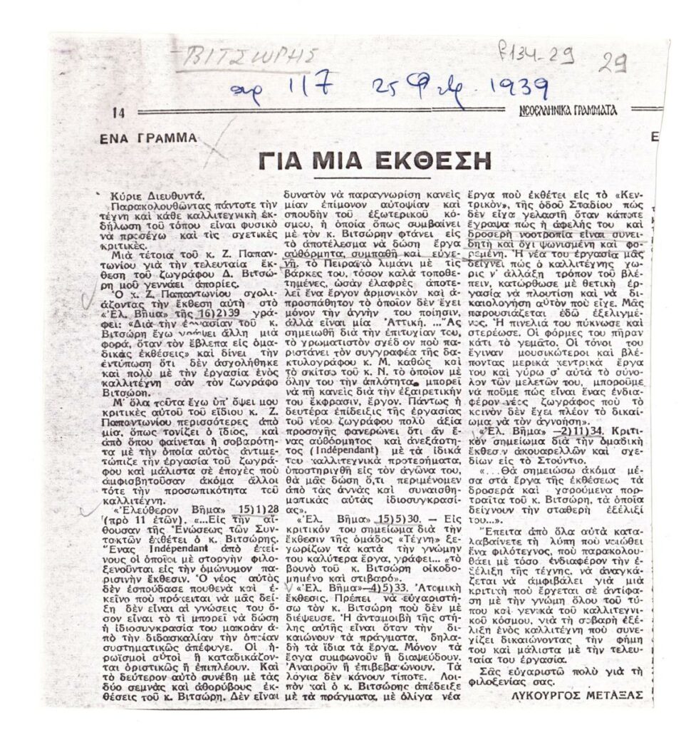 Φωτοαντίγραφο, χαρτί, 15×13 εκ.,δημοσίευσης κριτικής για τον Μίμη Βιτσώρη και το έργο του. Εντάσσεται στη στήλη “Ένα γράμμα” και απευθύνεται στο διευθυντή του εντύπου.