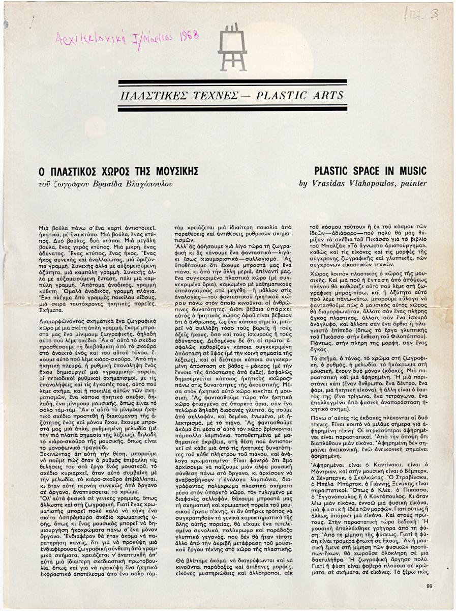 Απόκομμα περιοδικού, χαρτί ιλουστρασιόν, 2 φφ, στα ελληνικά και στα αγγλικά. Άρθρο του καλλιτέχνη που δημοσιεύτηκε στο περιοδικό ΑΡΧΙΤΕΚΤΟΝΙΚΗ. Εικονογραφείται με αναπαραγωγή έργου. Στην κορυφή της πρώτης σελίδας επιγραφή.