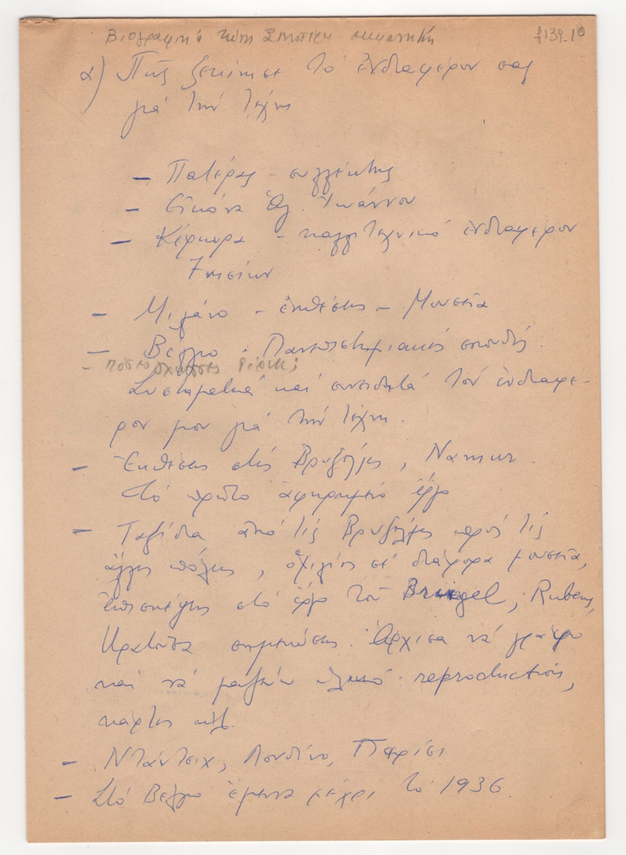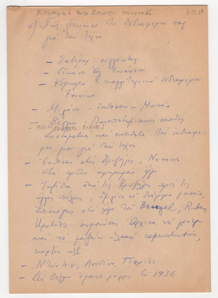 Κείμενο, χειρόγραφο, χαρτί, 9φφ, 28,0×19,8 εκ., στα ελληνικά. Προσχέδιο συνέντευξη, όπου καταγράφονται οι ερωτήσεις και δίνονται οι γενικές συνιστώσες των απαντήσεων.